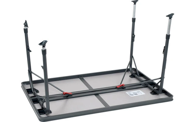 Sehr stabiler Campingtisch mit hoher Qualität. Die zusätzlich integrierten Aluminiumschienen an der Unterseite des Tisches und robuste, verstärkte Tischbeinrohre sorgen für extra Stabilität. Die Tischplatte ist hitzebeständig und wasserdicht.