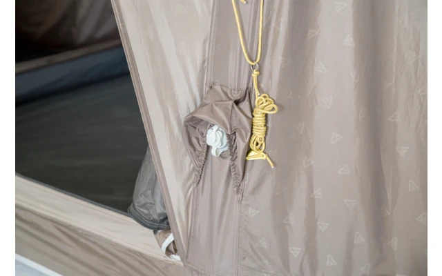 Der überdachte, seitliche Eingang ermöglicht eine Belüftung auch bei widrigen Wetterbedingungen. Die Schlauchkonstruktion aus thermoplastisches Polyurethan (TPU) sorgt dafür, dass das Zelt in wenigen Minuten steht. Die fest eingenähte Bodenplane hält das Zelt frei von Sand, Wasser und Insekten.