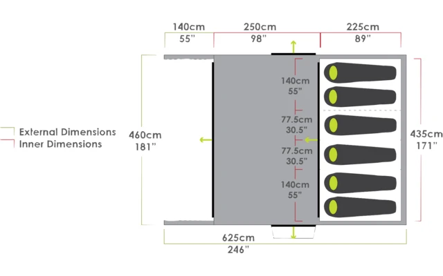 Das Gestänge verfügt über eine zentrale Firststange, die für eine stabile Struktur unter allen Bedingungen sorgt, und der zentrale Aufblaspunkt ermöglicht einen mühelosen Aufbau.